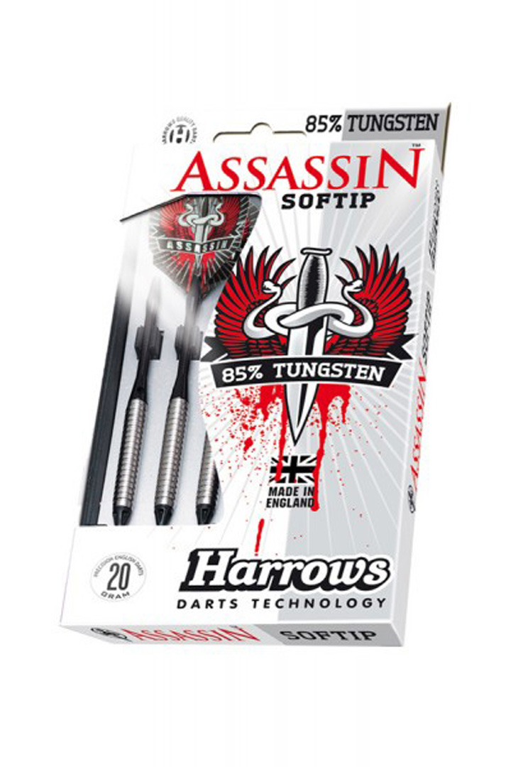 Harrows Assassin soft tips Darts. 85% tungsten knurled barrels and weight of 16 grams (14 grams only barrel). Harrows darts with aluminium shafts and Hologram flights. Slim box included.