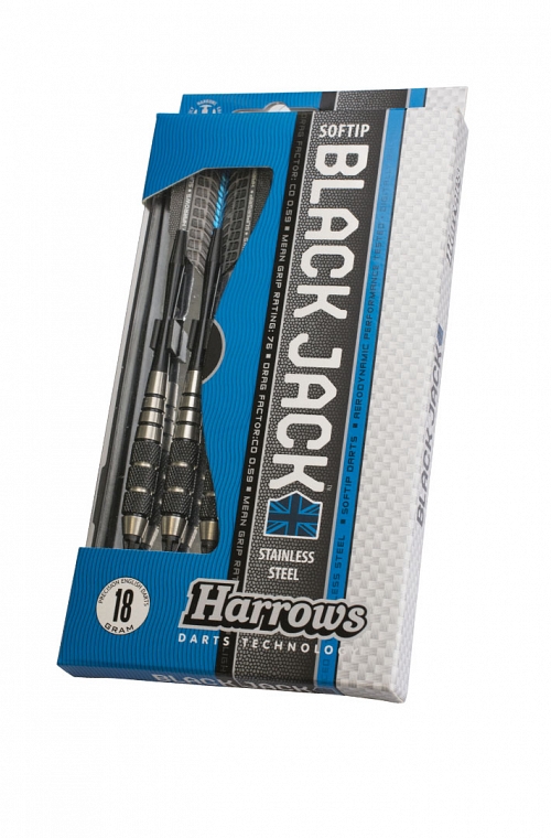 Harrows Black Jack soft tips Darts. Stainless steel barrels and weight of 16 grams (14 grams only barrel). Harrows darts with Speedline shafts and Supergrip 1701 flights. Slim box included.