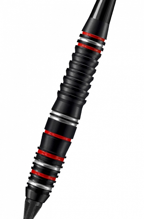 Harrows Fire High Grade Alloy soft tips Darts. Made using the hardened alloy. The tapered barrel is mid-weighted with a mix of shark and ring cuts, giving it a striking appearance and optimum fell. Taking inspiration from Fire Inferno, this darts is has a durable black coating with vibrant silver and red rings.