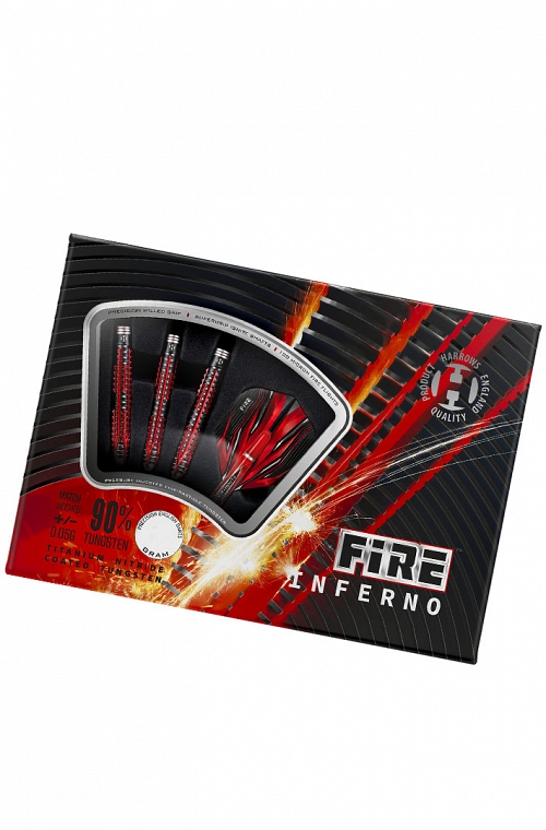 Harrows Fire Inferno soft tips Darts. Fire Inferno has been meticulously manufactured using the best material and most advanced techniques available. Fire effect, bi-latelal milling combined with reverse ring cuts to achieve its unique grips sequence. Finished with tough, black titanium nitride and vivid metallic red coating.