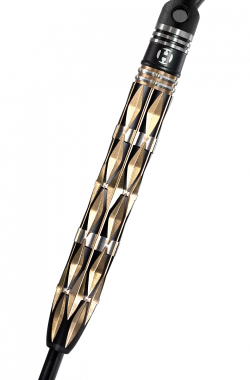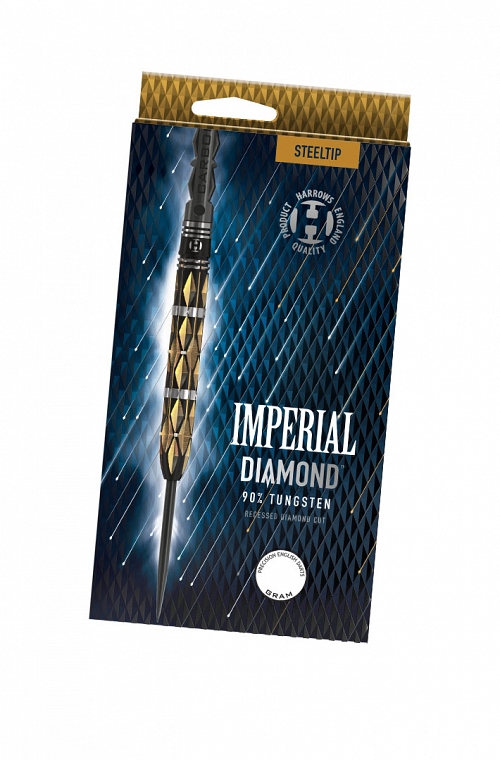 Harrows Imperial Diamond steel tip darts. This stunning 90% tungsten dart showcases our exceptional machining capabilities, with recessed diamond cuts along the length of the barrel and silver grip protrusions. Finished with tough black titanium nitride and eye-catching gold coatings.