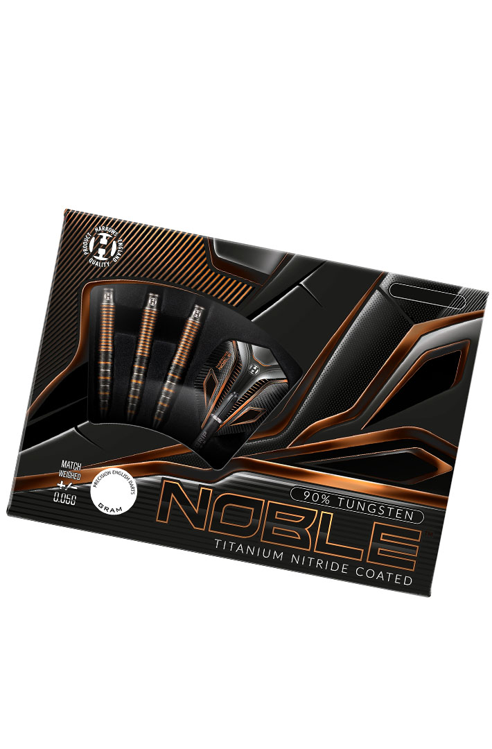 Harrows Noble soft tips Darts. Finest injection moulded 90% tungsten. Unique barrel shape with tapered front and ergonomic, concave rear. Combination of Predator grip at the front and ring grip at the back. Finished in a striking black, silver and rich gold 3 colour combination.