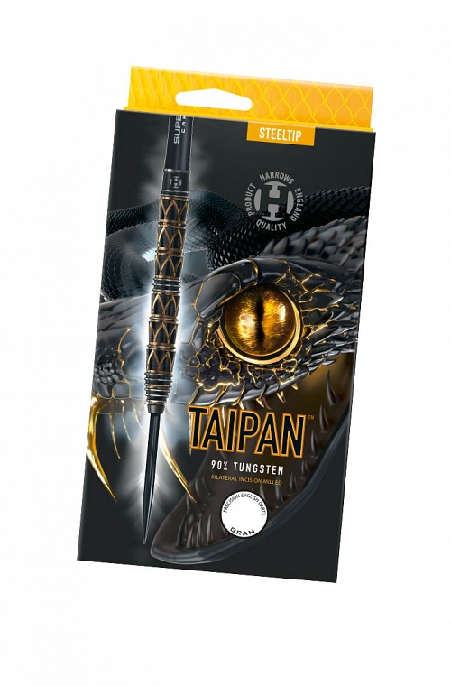 Harrows Taipan steel tips Darts. Made using 90% tungsten. Bilateral incision milling combined with precision ring cuts, resulting in a unique grip seguence. Mid-balanced, parallel barrel. Finished with tough, black titanium nitride and metallic gold coating.