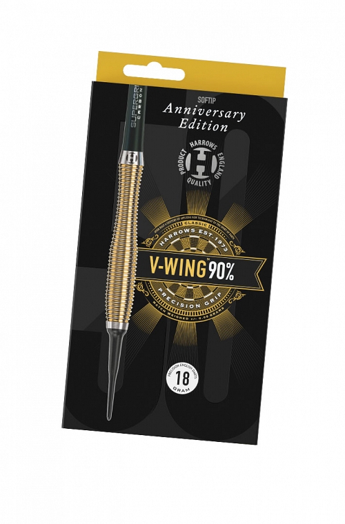 Harrows V-Wing soft tips Darts. The unique barrel shape of the V-Wing darts made them an instant favourite when released in 2004. This dart combines a precision ringed grip with the classic curved 'V-Wing' barrel profile; a distinctive dart design, loved by many. Coated in tough gold titanium nitride.