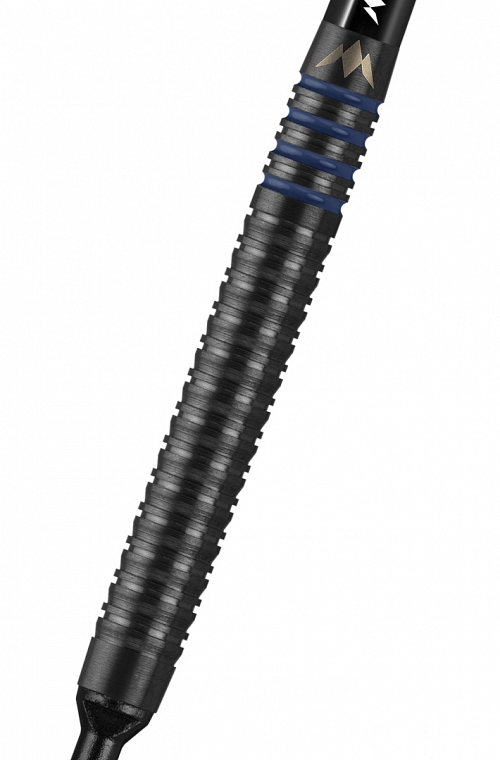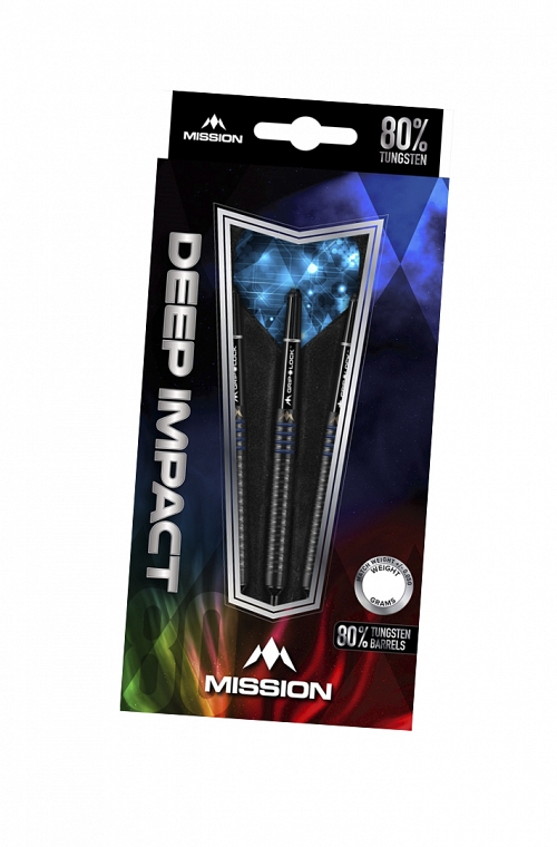 The Mission Deep Impact M4 Blue Soft Tip features a straight barrel. Both shark and fine radial grooves are incorporated along the length of the barrel. The striking and durable titanium nitride coating is complimented by 4 contrasting blue rings and the Mission logo which is laser etched into the rear of the barrel.
