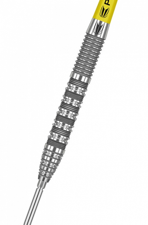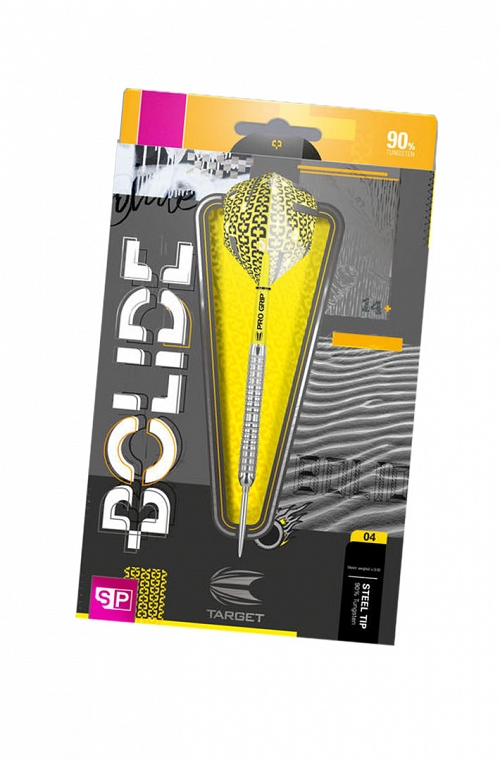 Target Bolide 01 steel tip darts. 21 grams barrels with 90% tungsten. Intricately constructed with precise radial grooved cuts and a hand-sandblasted coating gives the dart added grip and feel. Each barrel is finished with a yellow Pro Grip shaft and eye-catching flight exclusively designed for the range. The collection is tailored with Target's Swiss Point system.