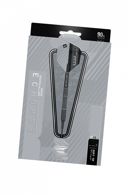 Target Echo 13 soft tip Darts. 90% tungsten barrels and 18 grams of weight. Each barrel features a stunning Black PVD coated barrel with intricate radial grooves. The barrel is further enhanced with grey paint and the revolutionary hand sandblasted grip which is added into the grooves. The sandblasting uses extremely fine particles to create a distinctive matte texture aiding grip and feel.