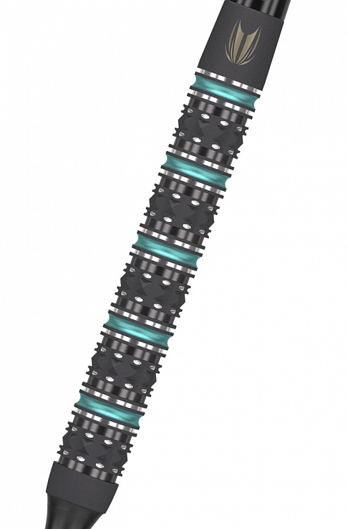 Target Rob Cross Black soft tip darts. The barrel offers multiple grip profiles including CNC milling throughout offering a firm grip which is then separated by radial grooves. These grooves are then overlaid with a teal performance coating adding to the finish of the barrel.