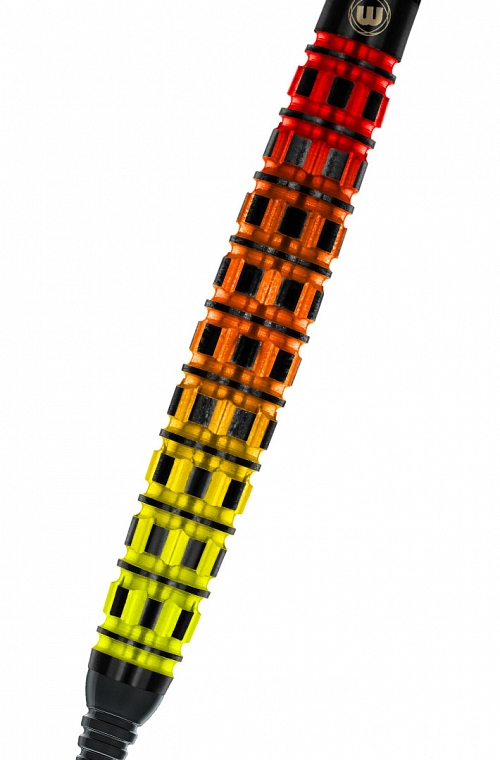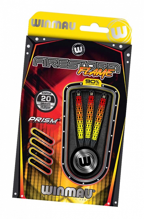 Winmau soft tip darts Firestorm Flame. 18 grams barrels (20 gram full dart) with 90% tungsten. A radical, visual design completed with the latest mill-grip technology the entire length of the dart. Delivering the world's most explosive looking darts with performance to match.
