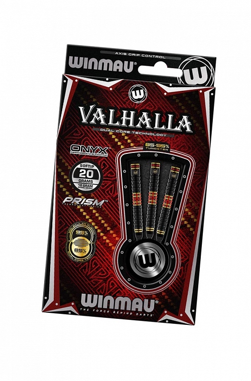 Winmau soft tip darts Valhalla. 18 grams barrels (20 gram full dart) with 90% tungsten. Valhalla creates the darting headlines yet to be written. A stunning combination of Onyx PVD, red-gold detailing and the latest Torque Force enabled milled grip control.