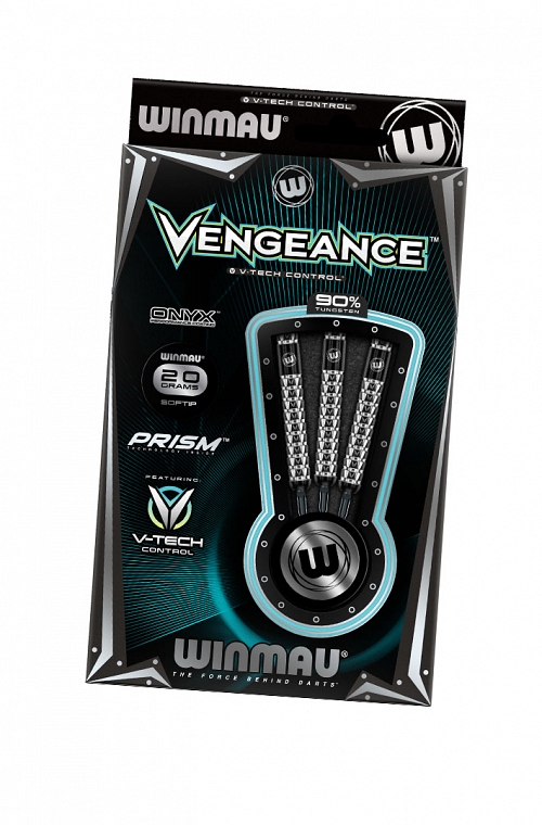Winmau Vengeance soft tip darts. 18 grams barrels (20 gram full dart) with 90% tungsten. Featuring V-Tech Control three-dimensional technology, the smartest, most biomechanically precise darts ever made. Featuring 7-degree power accumulator dynamics.