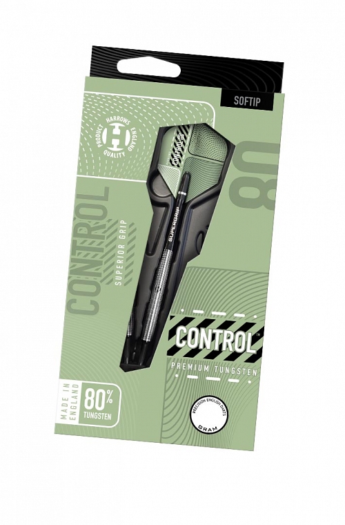 Dardos Harrows Control Tapered de punta de plástico. La gama Control están fabricados con 80% tungsteno de alta calidad. Cuenta con cortes de microanillos prominentes a lo largo del barril, lo que ofrece al jugador un agarre fuerte.