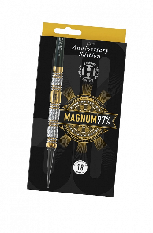 Dardos Harrows Magnum de punta de plástico. Magnum sigue siendo el dardo con el porcentaje de tungsteno más alto que Harrows haya ofrecido jamás: 97 %. Este alto porcentaje permite un cañón extra delgado, que maximiza el potencial de puntuación para los jugadores profesionales. La combinación de distintas secciones moleteadas de alto agarre hizo de este cañón paralelo una opción popular en todo el mundo. Recubierto con nitruro de titanio dorado resistente.