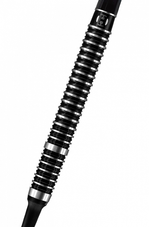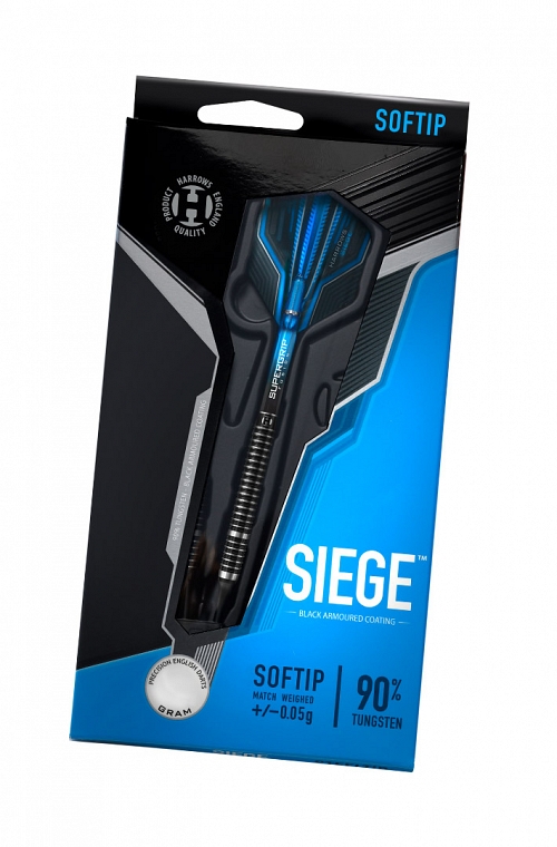 Dardos Harrows Siege de punta de plástico. Fabricado con 90% tungsteno. Con empuñaduras de anillos de precisión que cubren todo el barril y acabado con un resistente recubrimiento de nitruro de titanio negro.