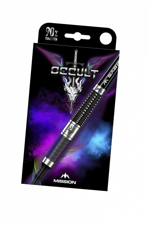 Los dardos Mission Occult tienen forma de torpedo con ranuras radiales finas y contorneadas a lo largo de las secciones delantera y trasera del cañón, resaltadas con pequeños cortes fresados horizontales en la parte trasera del cañón. Revestimiento de PVD negro y coral, seguido de un nuevo mecanizado de precisión.