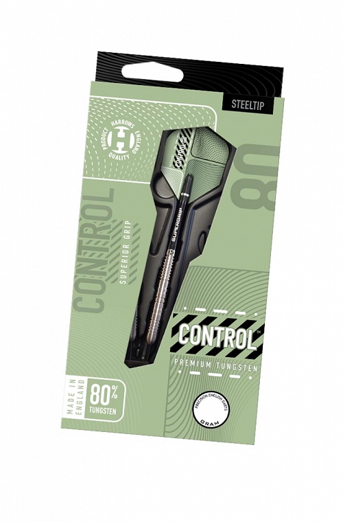 Dardos Harrows Control Parallel de punta de acero. La gama Control están fabricados con 80% tungsteno de alta calidad. Cuenta con cortes de microanillos prominentes a lo largo del barril, lo que ofrece al jugador un agarre fuerte.