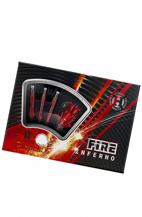 Dardos Harrows Fire Inferno de punta de acero. Fire Inferno ha sido fabricado meticulosamente utilizando el mejor material y las técnicas más avanzadas disponibles. Efecto fuego, fresado bi-latelal combinado con cortes de anillo inverso para lograr su secuencia de agarre única. Acabado con nitruro de titanio negro resistente y revestimiento rojo metálico vivo.