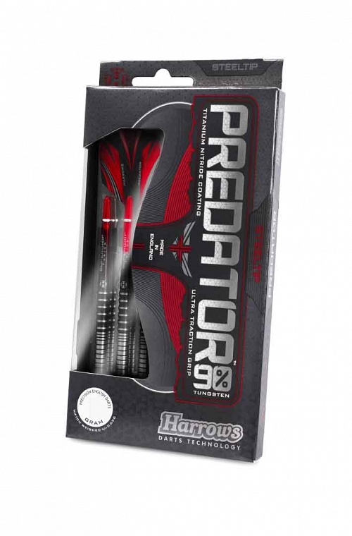 Dardos Harrows Predator de punta de acero. Barriles de 90% de tungsteno con un peso de 21 gramos. Dardos Harrows formados por cañas Supergrip Fusion y plumas Prime. Incluye caja de formato slim.