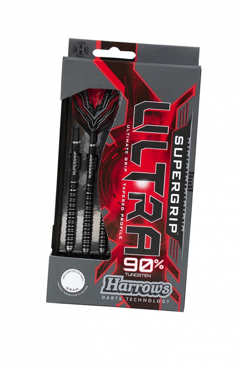 Dardos Harrows Supergrip Ultra de punta de acero. Fabricado con el 90% de tungsteno más fino. Una combinación única de anillos profundos simples y dobles a lo largo del barril, lo que da como resultado el agarre Supergrip reconocido mundialmente. Terminado con una capa negra duradera, luego vuelva a cortar para dejar un impresionante acabado de dos tonos.