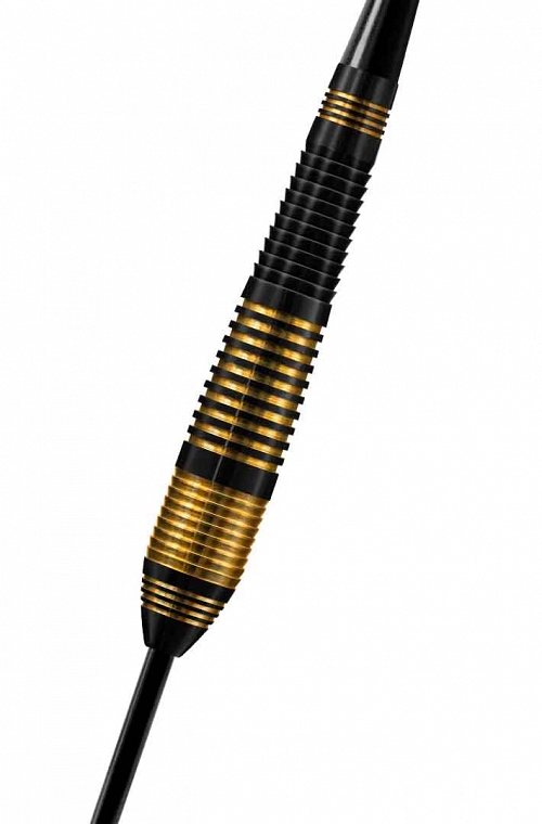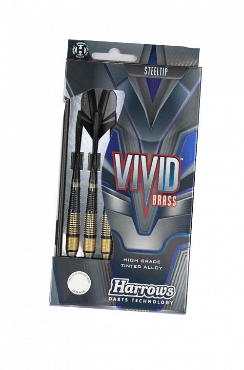 Dardos Harrows Vivid de punta de acero en color negro. Barriles de latón con un peso de 21 gramos. Dardos Harrows formados por cañas Speedline y plumas Vivid. Incluye caja de formato slim.