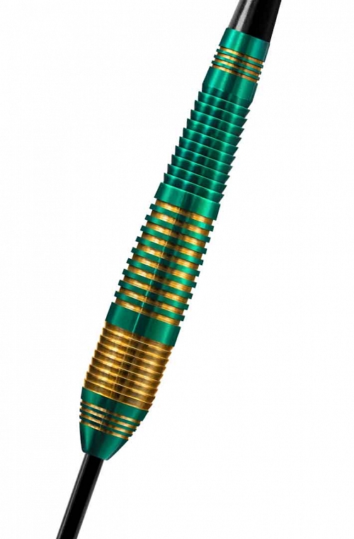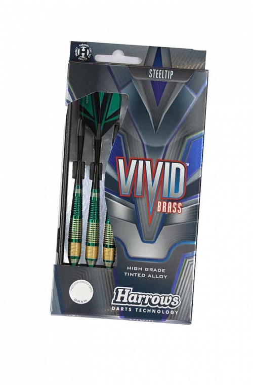 Dardos Harrows Vivid de punta de acero en color verde. Barriles de latón con un peso de 22 gramos. Dardos Harrows formados por cañas Speedline y plumas Vivid. Incluye caja de formato slim.