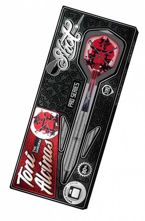 Dardos Shot Pro Series de punta de acero modelo Toni Alcinas. Barriles de 80% de tungsteno con un peso de 24 gramos completo. Dardos formados por cañas Shot Eagle Claw y plumas standard "The Samurai".