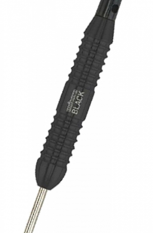 Dardos Unicorn Core Plus Black de punta de acero. Fabricados en latón con un peso ajustado de 24 gramos. Cilindro anillado en color negro, plumas Core 75 y cañas Gripper II.