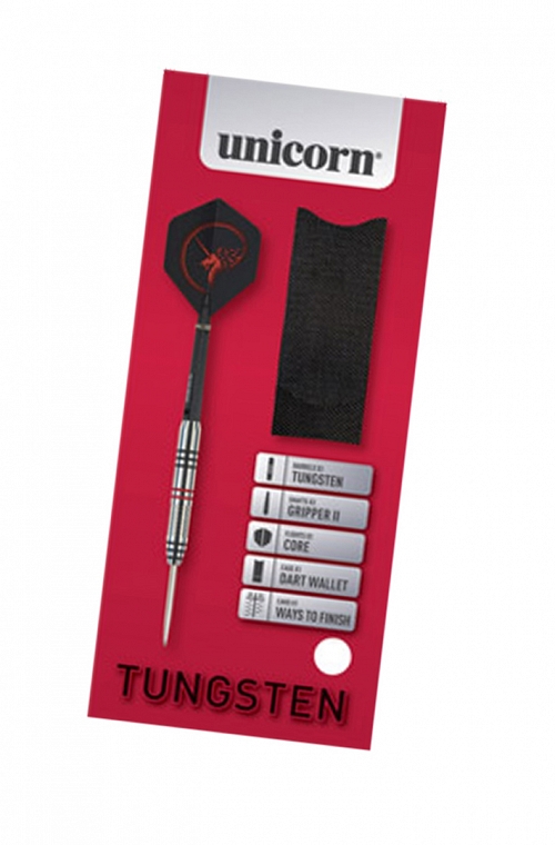 Dardos Unicorn Core Plus Tungsten de punta de acero. Barriles de 80% tungsteno con un peso de 23 gramos. Dardos Unicorn formados por cañas Gripper II y plumas Specialist.