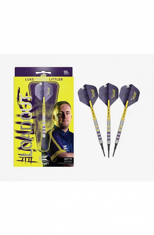 Dardos Target Luke Littler Loadout. El juego de dardos incluye un barril recto de 90% tungsteno de 47mm, con ranuras radiales para un mejor agarre con los dedos. A lo largo del elegante diseño, encontrarás pequeños detalles dentro de los surcos de los colores morado y amarillo característicos de "The Nuke".