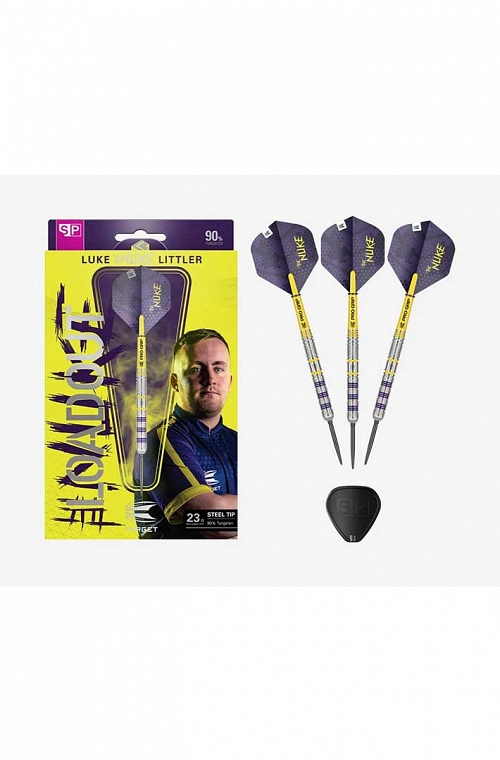 Dardos Target Luke Littler Loadout SP. El juego de dardos incluye un barril recto de 90% tungsteno de 52mm, con ranuras radiales para un mejor agarre con los dedos. A lo largo del elegante diseño, encontrarás pequeños detalles dentro de los surcos de los colores morado y amarillo característicos de "The Nuke". Con sistema Swiss Point.