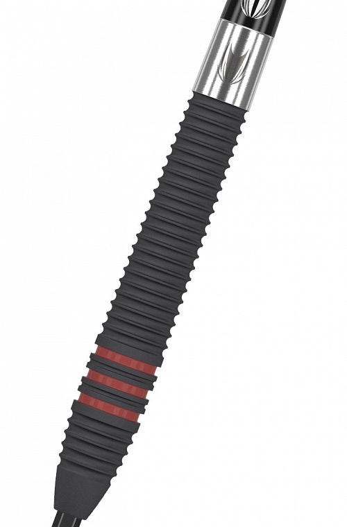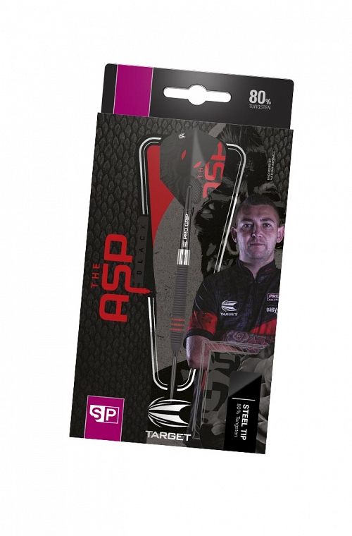 Dardos Target de punta de acero Nathan Aspinall Black SP. Con el innovador sistema Swiss Point. Barriles de 80% de tunsgteno, con perfil acanalado radial a lo largo del barril que ofrece un agarre uniforme y que mejor con los 3 anillos rojos 'Asp' en la parte delantera que ofrece un agarre y textura adicional. Acabado con un recubrimiento de Black PVD y chorro de arena que le da un toque mate.