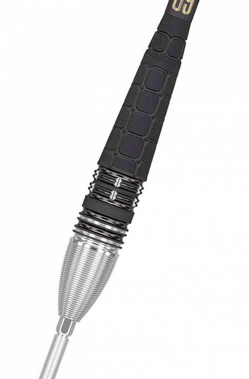 Dardos Target Power 9Five generación 9 con sistema Swiss Point. El barril ofrece un alto nivel de fresado CNC con extremo detalle. El barril cuenta con 3 áreas de agarre, el frente es un agarre basado en cromo nano que luego se mueve a una combinación de anillos fresados a máquina con detalles sutiles. Por último, en la parte trasera hay un diseño único que presenta una empuñadura tipo "cuadrado" que se creó utilizando máquinas de fresado de alta precisión.