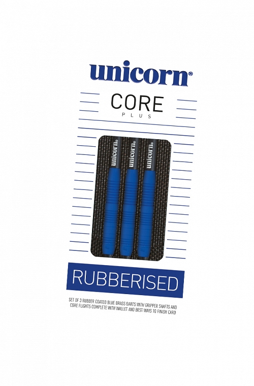 Dardos Unicorn Core Blue Brass de punta de plástico. Con barriles de latón de 18 gramos de peso en color azul. Juego compuesto de dardos, cañas gripper III y plumas Core 75.