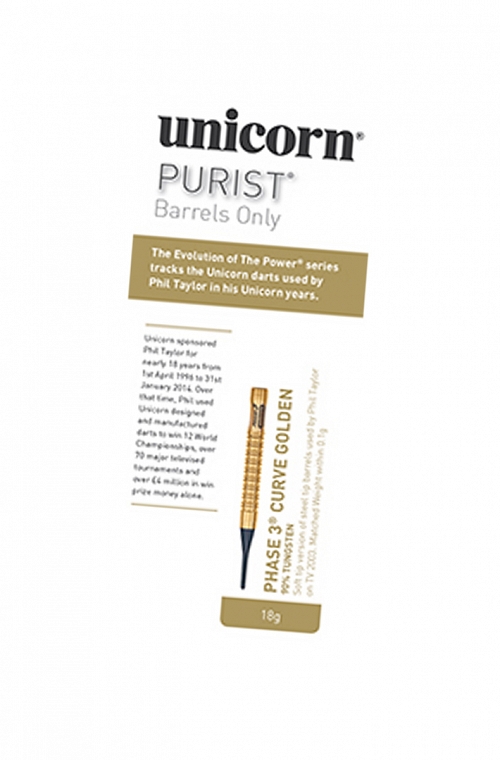 Dardos Unicorn Phase 3 Purist Curve Natural de punta de plástico. Barriles de 90% de tunsgteno y 18 gramos de peso. Solo barriles.