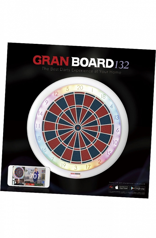 Diana electrónica Gran Board 132. Diana con aro estrecho (2 puntos en dobles y triples) con díametro de 33'5 cm. Este modelo es más insonoro y mejora la de los segmentos evitando rebotes y caidas de los dardos. Tambien se ha mejorado el sensor de dardos fuera evitando falsos contactos. La diana utiliza la misma app que el resto de dianas Granboard.