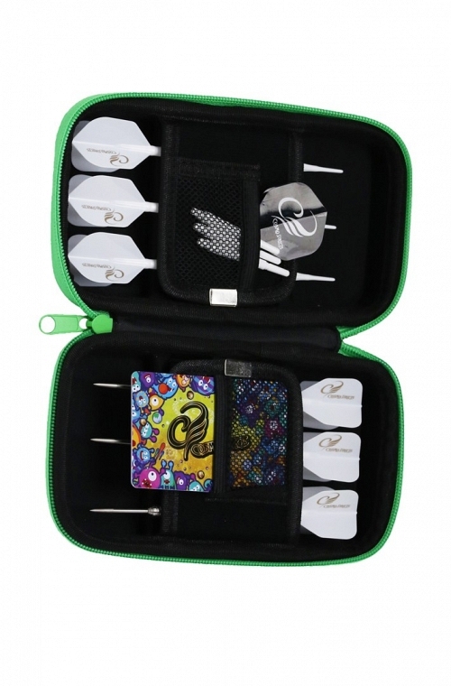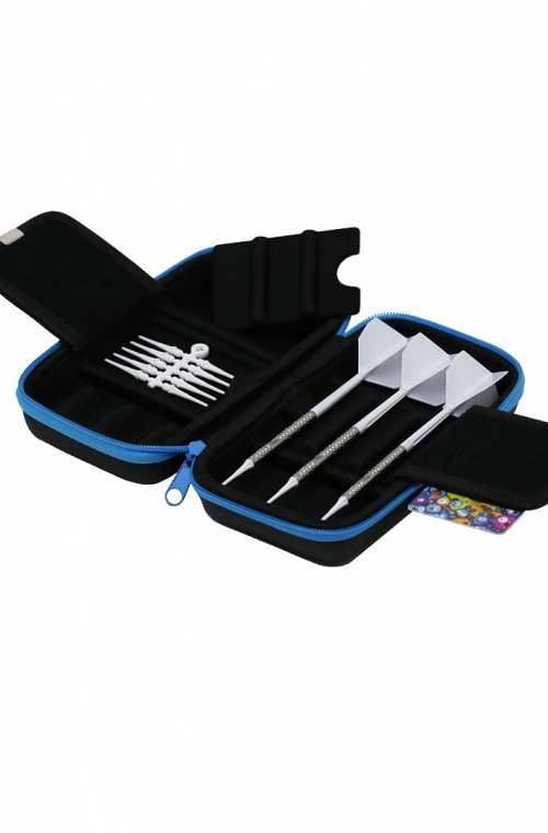 Estuche fabricado en EVA de gran calidad para almacenar hasta dos juegos de dardos completamente montados. Además incluye espacio para tarjetas, cañas y plumas. Color Azul.