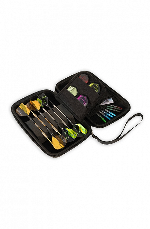 Estuche Harrows Player Pro 6. Con diseño exclusivo para el jugador "Woody". Fabricados con material EVA rígido, estos estuches pueden contener dos juegos de dardos completamente ensamblados y ofrecen un almacenamiento interno adicional significativo.
