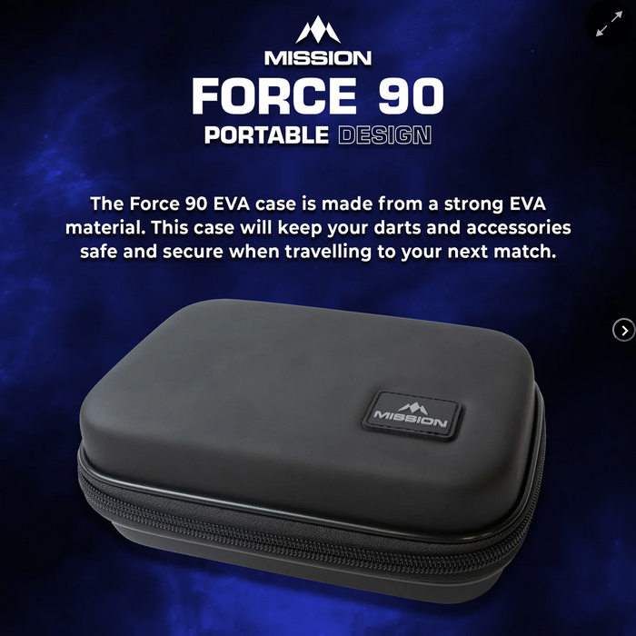 Estuche para dardos Mission Force 90 moldeada en EVA - Grande. Fabricado con un resistente material EVA, este estuche mantendrá tus dardos y accesorios ordenados Este estuche tiene capacidad para dos juegos de dardos completamente montados, junto con un compartimento para guardar plumas Mission Force 90 de repuesto.