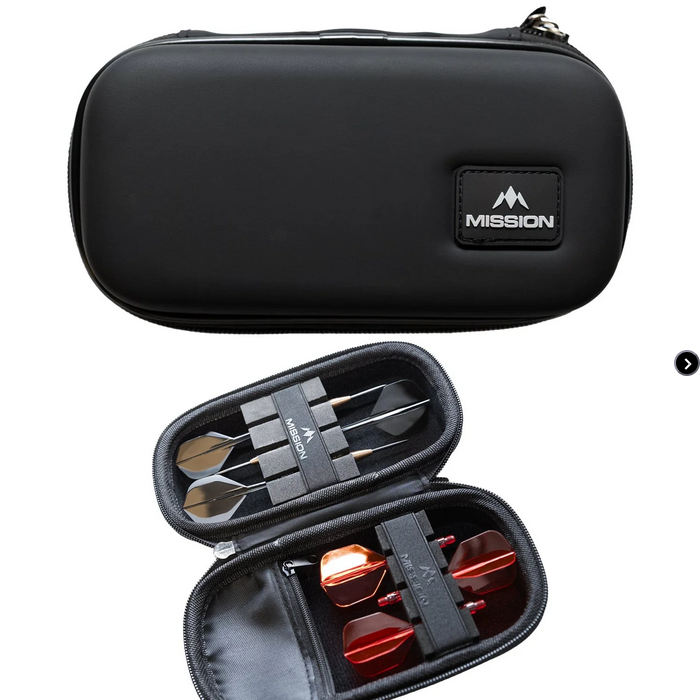 Este estuche para dardos tiene capacidad para un juego de dardos completamente montado en un lado, y un compartimento especialmente diseñado en el otro para guardar un juego de repuestos de plumas Mission Force 90. También incluye un compartimento adicional con cremallera para guardar otros accesorios de repuesto, como cañas y plumas.