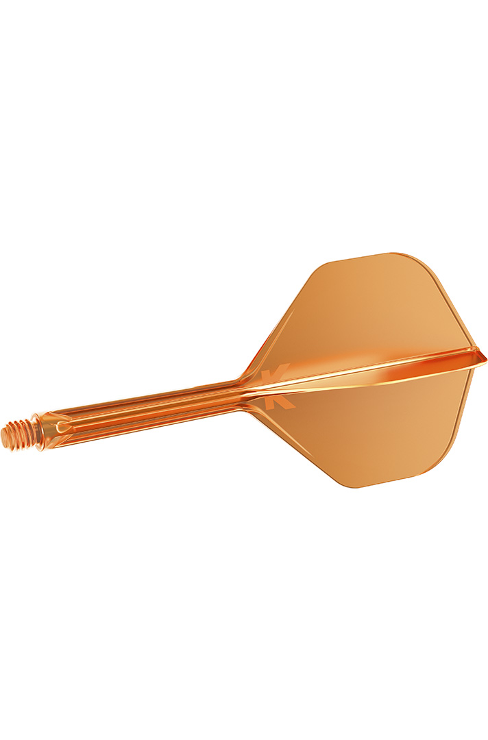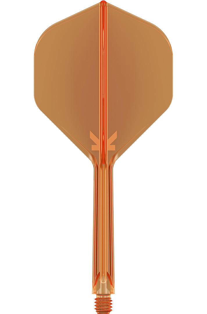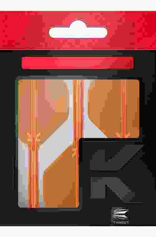 Plumas Target K Flex Neon. Geometría número 2 en color naranja. Al utilizar un sistema de molde de precisión para fusionar la pluma y la caña, las plumas son muy duraderas pero livianas y continúan manteniendo un ángulo de 90 grados. Para reducir la posibilidad de que rebote, K-Flex utiliza el sistema de giro patentado de Target que mueve el dardo si lo golpea otro.