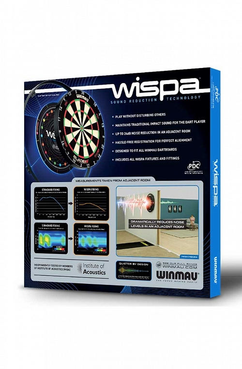 Los dardos nunca han sido tan silenciosos como con el sistema de reducción de sonido Winmau Wispa. Este innovador sistema de suspensión de Winmau asegura que su diana se silencie al máximo cuando sus dardos golpean la diana. El sistema de reducción de sonido Winmau Wispa consta de dos partes principales, un disco redondo al que se fija su diana y un anillo grande que usted fija a la pared. La diana a la que se sujeta su tablero de dardos se estira dentro de este anillo. De este modo, la diana no tiene contacto directo con la pared.