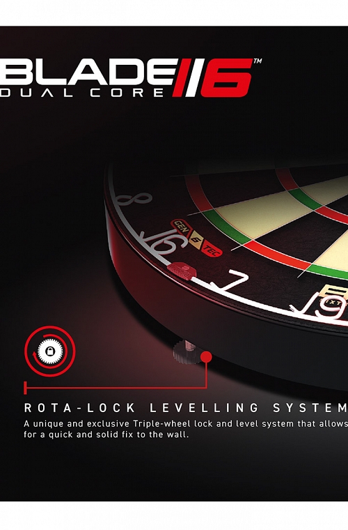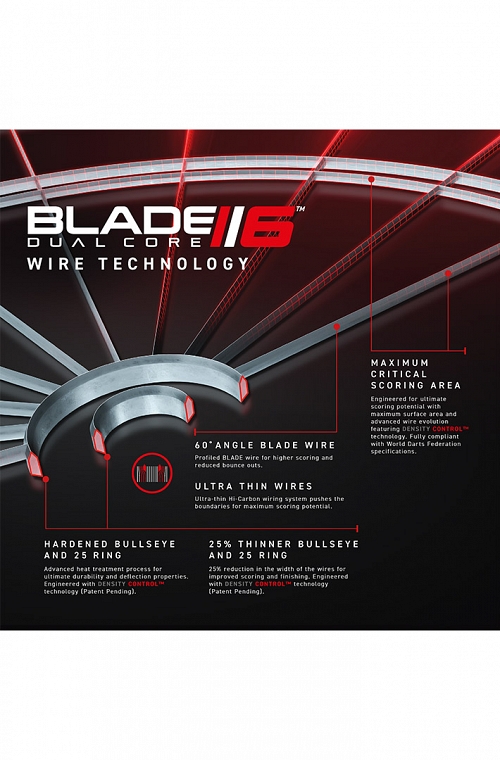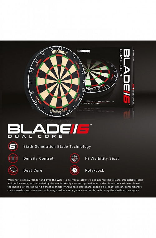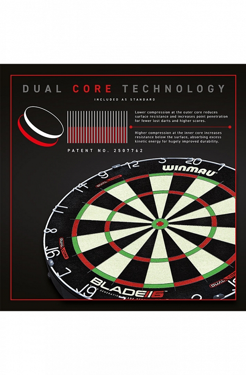 Alvo Winmau Blade 6 Dual Core. A base de alvo para dardos Dual Core patenteada oferece uma superfície de jogo perfeita e de alta visibilidade e densidade de núcleo otimizada projetada para pontuação máxima. A densidade reduzida no núcleo externo facilita a penetração suave do dardo, enquanto o núcleo interno de alta densidade absorve o excesso de energia cinética, otimizando a retenção e durabilidade do dardo.