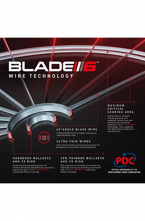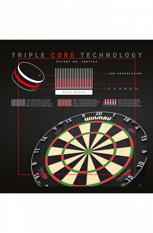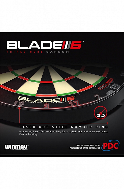Alvo Winmau Blade 6 Triple Core. O Triple Core Carbon apresenta um sistema totalmente novo patenteado com uma superfície de jogo sem costura e uma terceira camada de alta compressão, com sisal reforçado com fibra de carbono. O máximo em construção de alvos, proporcionando densidade de fibra ideal, retenção de dardos incomparável e pontuação máxima.