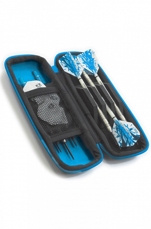 Caso Harrows Blaze. Feito em EVA e cor aqua. Estojo rígido fino que oferece proteção para dardos totalmente montados equipados com vôos tradicionais ou de asa fixa. a tampa contém uma rede de acessórios de bolso duplo para guardar dardos, voos e acessórios sobressalentes.