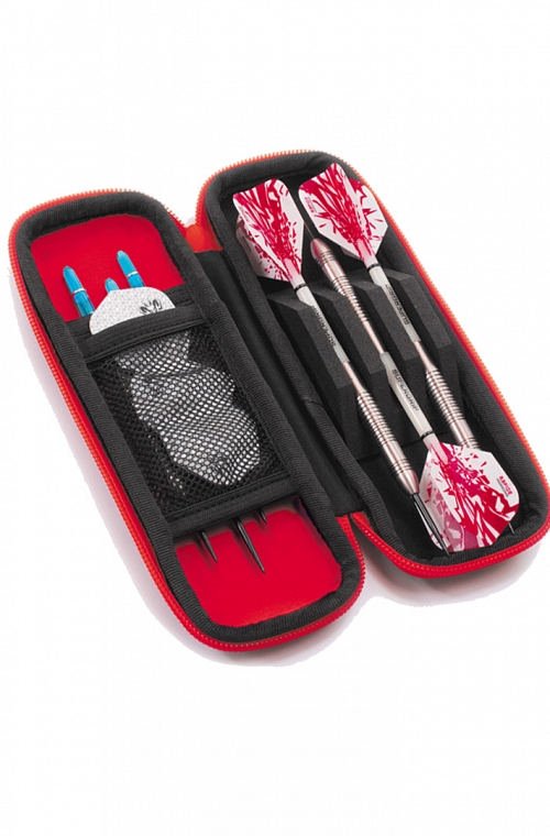 Caso Harrows Blaze. Feito em EVA e cor vermelho. Estojo rígido fino que oferece proteção para dardos totalmente montados equipados com vôos tradicionais ou de asa fixa. a tampa contém uma rede de acessórios de bolso duplo para guardar dardos, voos e acessórios sobressalentes.