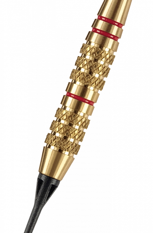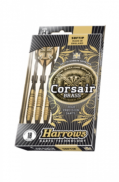Dardos Harrows Corsair de ponteira plástica. Cilindros knurled de bronze em cor vermelho e 16 gramas (14 gramas só cilindros). Dardos Harrows formados por hastes de alumínio e voadores Hologram. Inclui caixa slim.