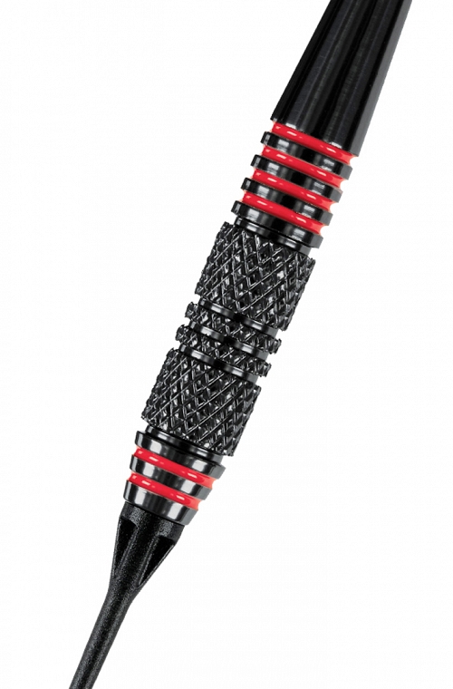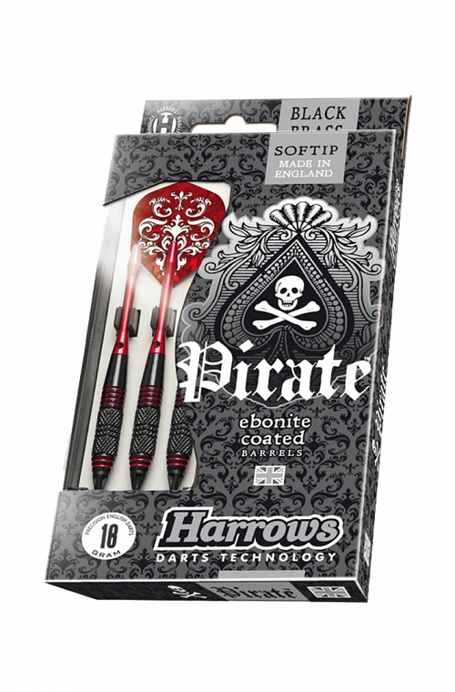 Dardos Harrows Pirate de ponteira plástica. Cilindros knurled de bronze em cor vermelho e 18 gramas (16 gramas só cilindros). Dardos Harrows formados por hastes de alumínio e voadores Hologram. Inclui caixa slim.