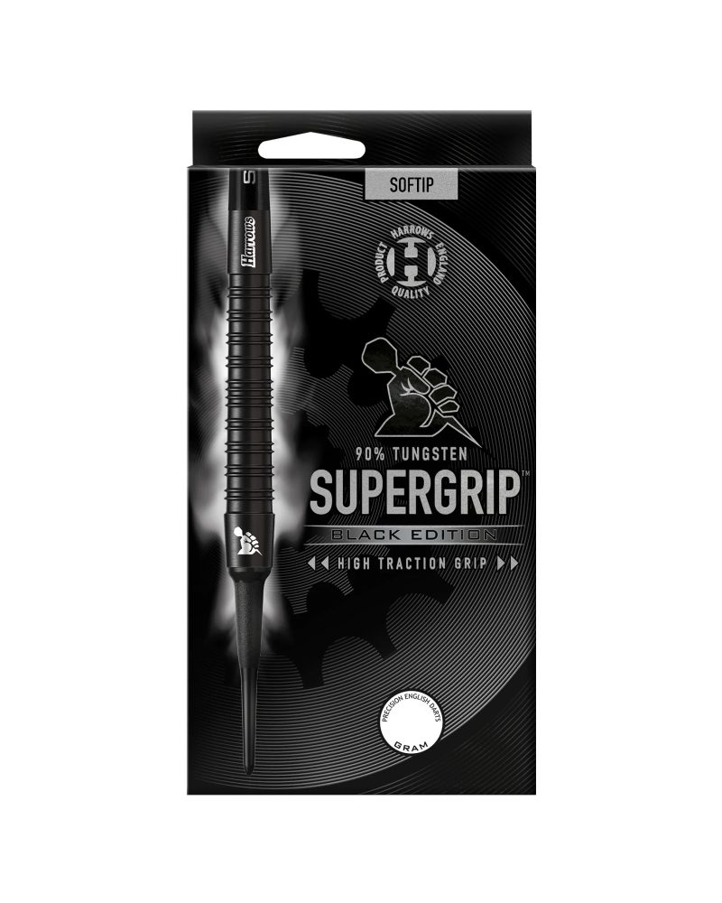 Dardos Harrows Supergrip Black de ponteira plastica. Fabricado com o melhor tungstênio 90%. Uma combinação única de anéis profundos simples e duplos ao longo do comprimento do cilindro, resultando no aperto Supergrip mundialmente conhecido. Terminou com um revestimento preto durável, depois recorte para deixar um acabamento de dois tons deslumbrante.