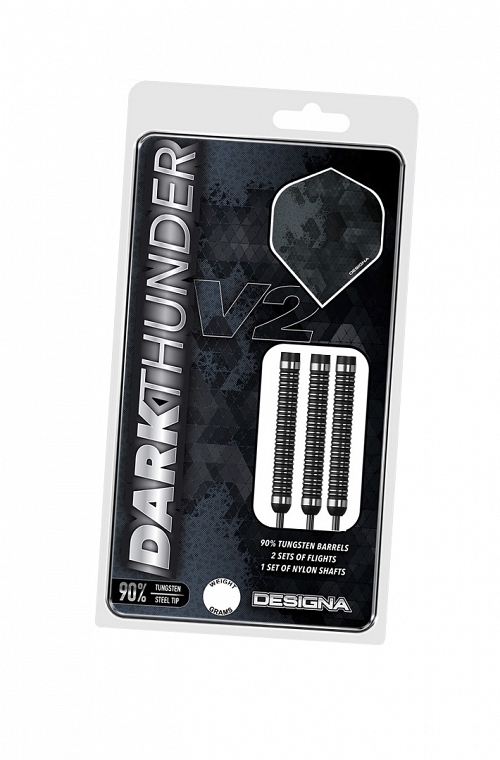Dardos Designa Dark Thunder V2 de ponteira de aço. Cilindros de 90% tunsgtênio com um distinto aperto de anel duplo. Os dardos tem um peso de 20 gramas só o cilindro. Vem com hastes de Nylon e voadores Designa.