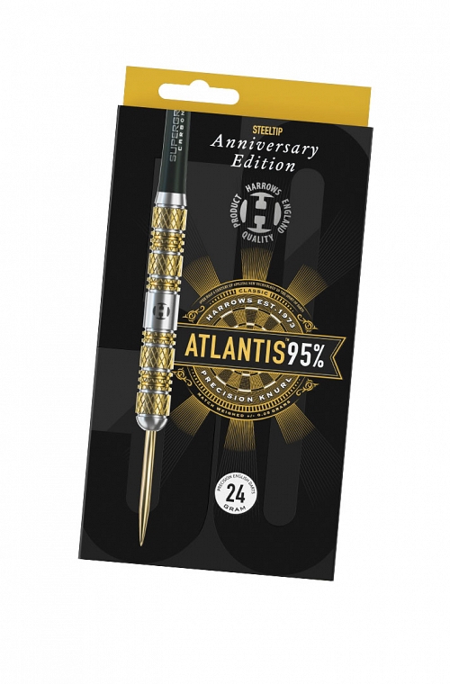 Dardos Harrows Atlantis de ponteira de aço. Os dardos Atlantis foram os primeiros dardos 95% de tungstênio já lançados pela Harrows. Esses dardos apresentam um padrão serrilhado pesado em segmentos ao longo do comprimento do cano paralelo para fornecer uma pegada firme e consistente. Revestido com nitreto de titânio dourado resistente.